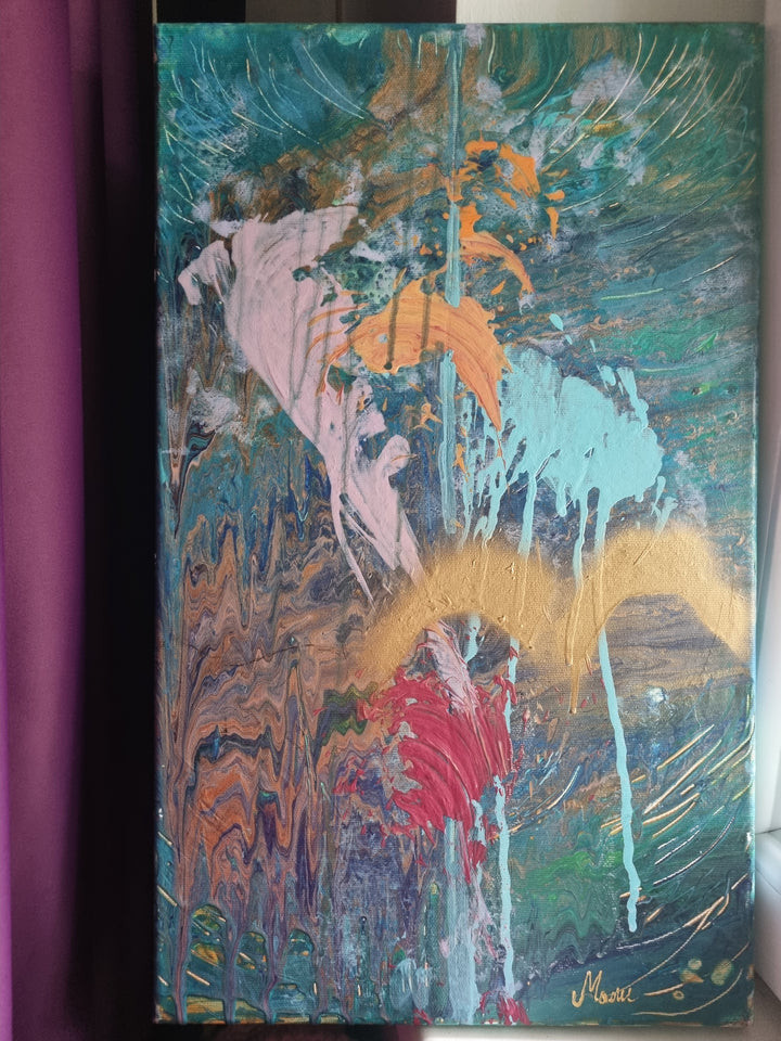 This abstract masterpiece bursts with joyful splashes of color, an homage to Jackson Pollock’s iconic Number 11 (1952).